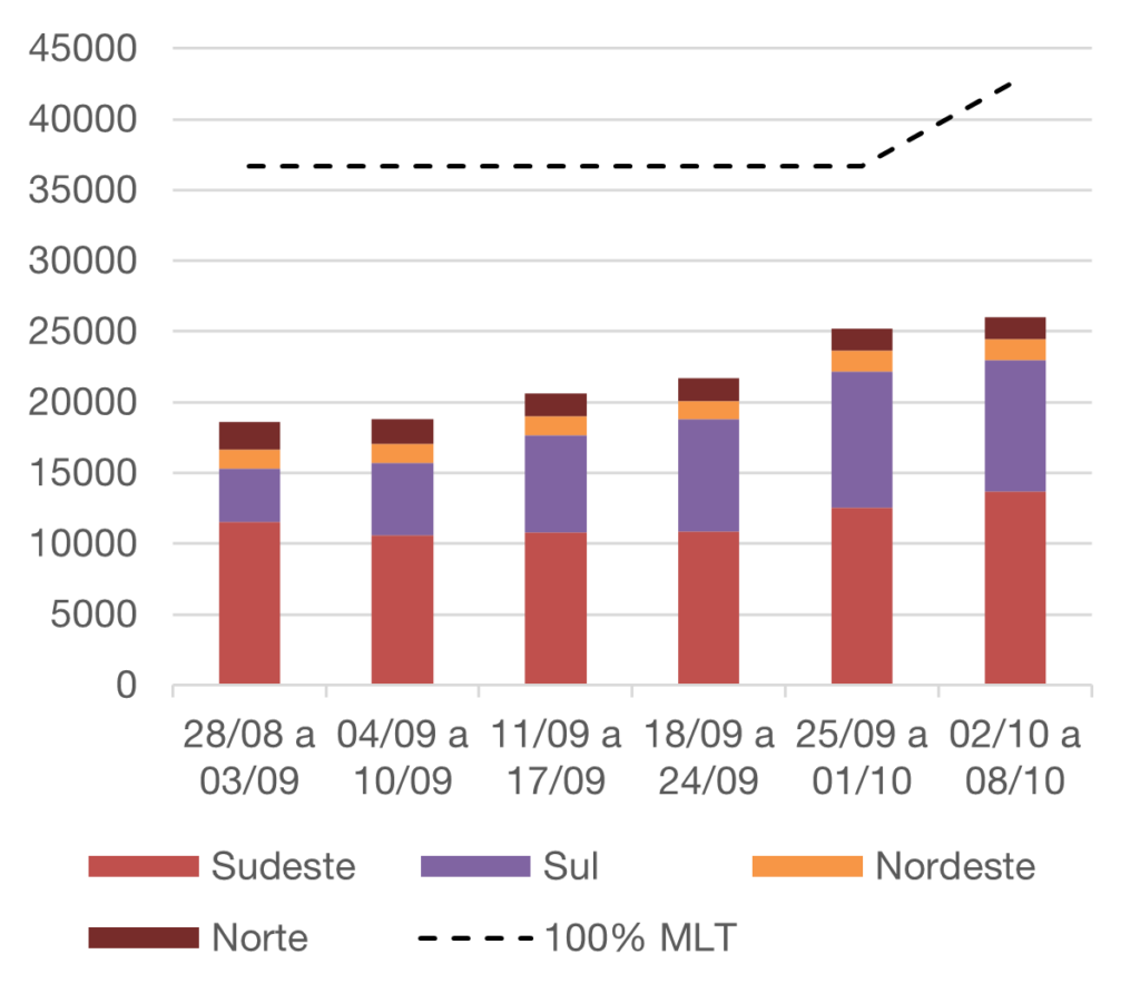 Analisando a previsão semanal da ENA na RV0 de agosto do ONS (26/ago), verifica-se uma elevação significativa da ENA ao longo das semanas, atingindo cerca de 26 GWmed no SIN na semana de 02 a 08 de outubro.
