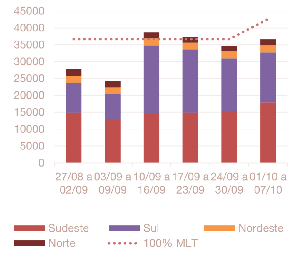 Analisando a revisão da previsão semanal da ENA de setembro (01/set), verifica-se a tendência de aumento no volume de ENA ao longo das semanas, atingindo cerca de 37 GWmed na semana de 01 de outubro a 07 de outubro.