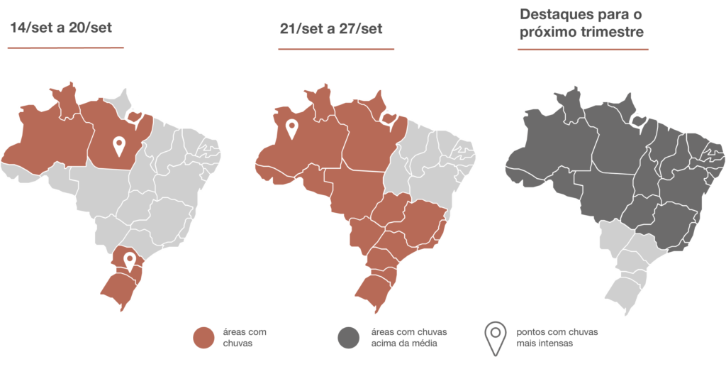 - 21/set a 27/set: Chuva de fraca a média na região Norte e chuva fraca em parte do Centro-Oeste, no Sudeste e Sul.