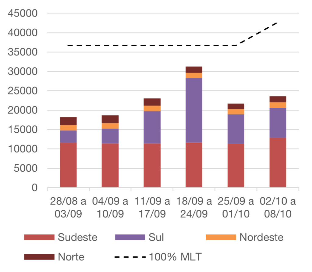 Analisando a previsão semanal da ENA na RV3 de agosto do ONS (16/set), verifica-se uma elevação significativa da ENA ao longo das semanas, superando a marca dos 30GW entre 18/09 a 24/09, e logo após reduzindo-se a menos de 25GW até a semana entre 02/10 a 08/10.