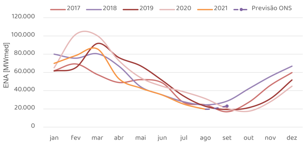 Na previsão de ENA diária para o Dessem, feita pelo ONS em 20 de setembro, verifica-se uma tendência de forte queda da ENA até o dia 28 de setembro, reduzindo-se a cerca de 20 GWmed no mesmo dia.